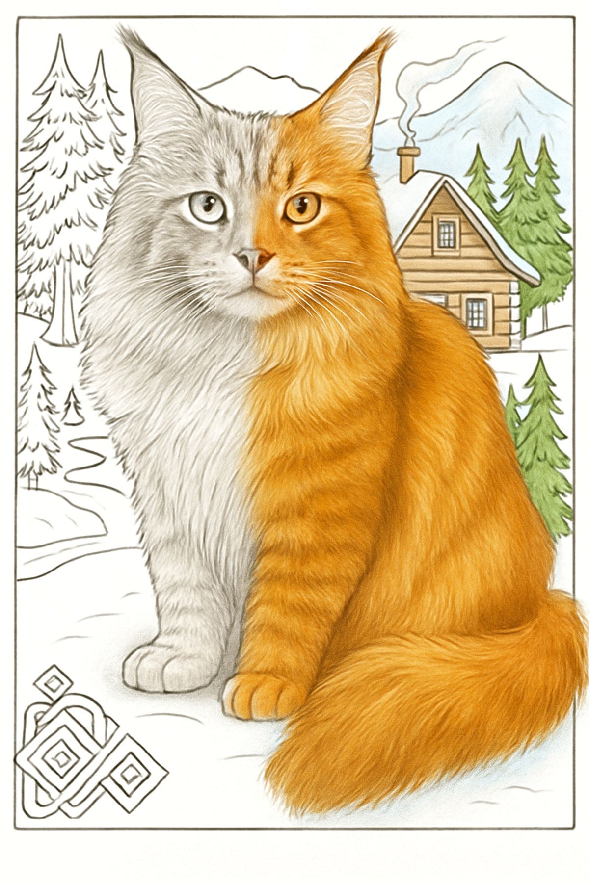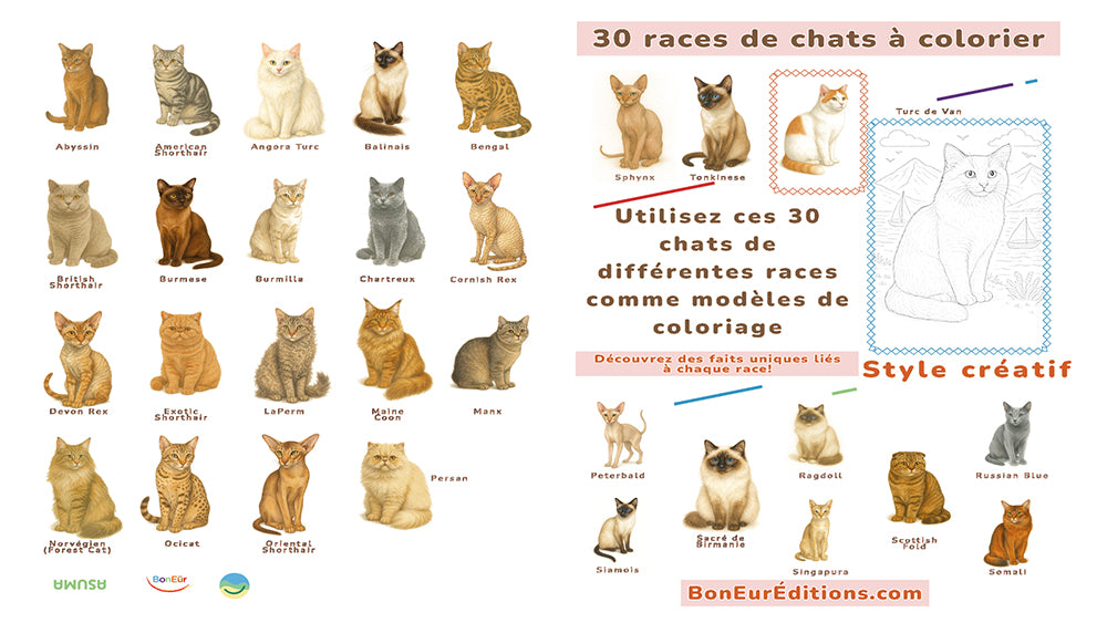 Chaque illustration offre un arrière-plan inspiré du paysage typique associé à la race du chat à colorier.